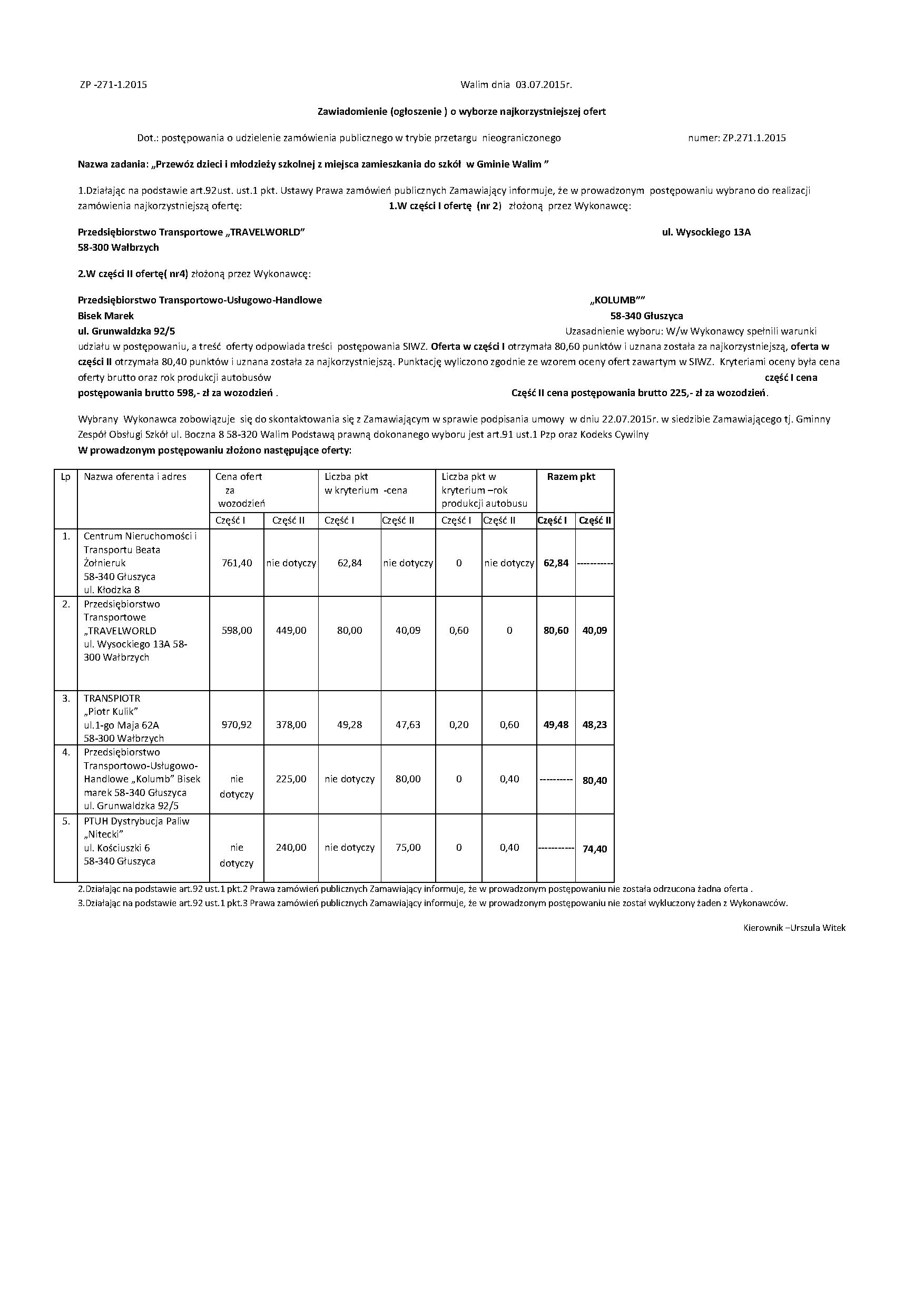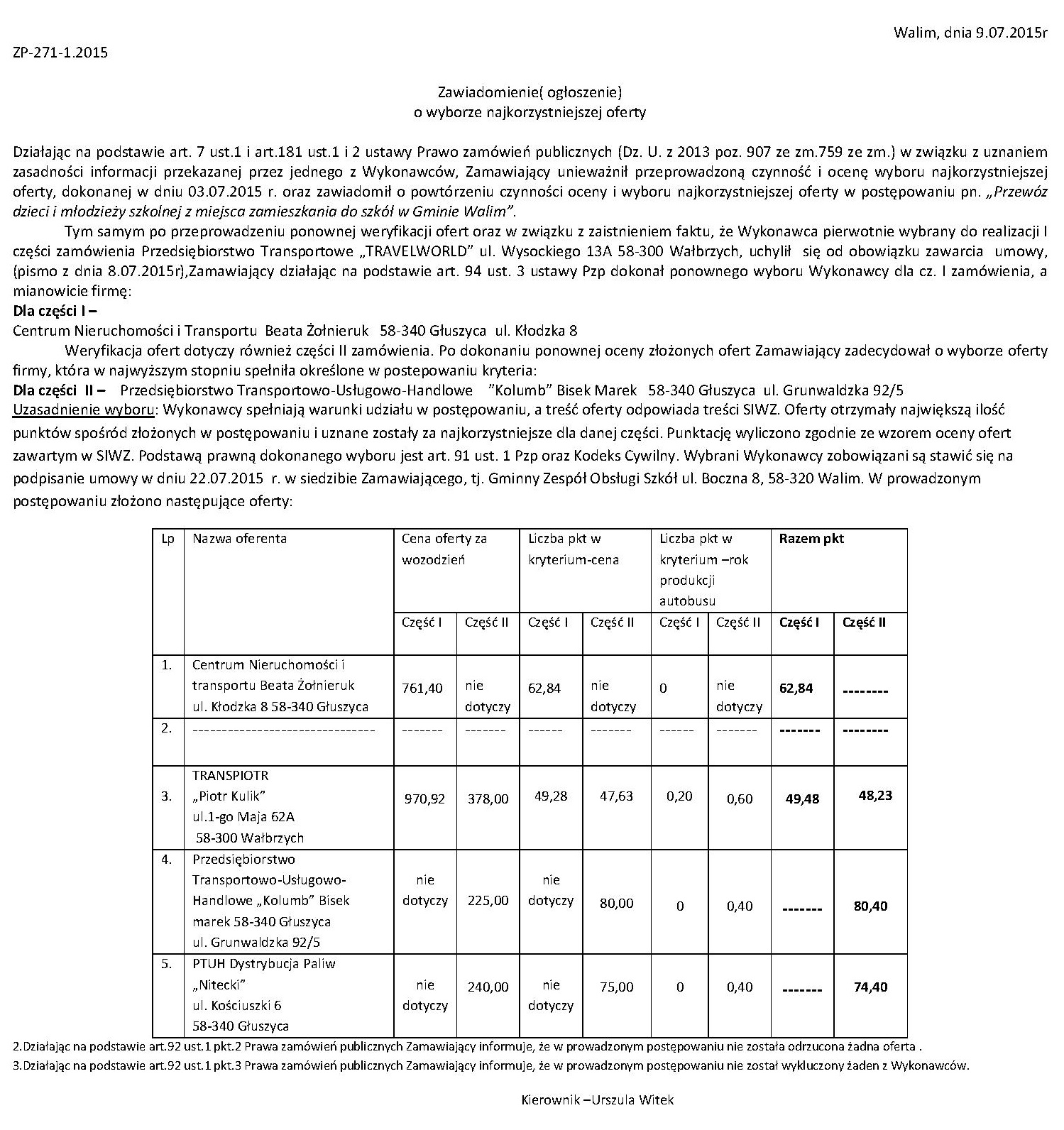 W dniu 6.07.2015r do siedziby zamawiającego wpłynęła informacja od uczestnika biorącego udział w postępowaniu o udzielenie zamówienia publicznego „Przewóz dzieci i młodzieży szkolnej z miejsca zamieszkania do szkół w Gminie Walim”, o występujących niezgodnościach w złożonych dokumentach przez wybraną firmę do realizacji w/w zamówienia. W związku z powyższym Zamawiający anuluje czynności wyboru oferenta. Ponownie dokona analizy i oceny ofert wszystkich złożonych dokumentów do przetargu przez wszystkich oferentów. Czynności te zamawiający wykona zgodnie z art.85ust.1 w terminie związania z ofertą.