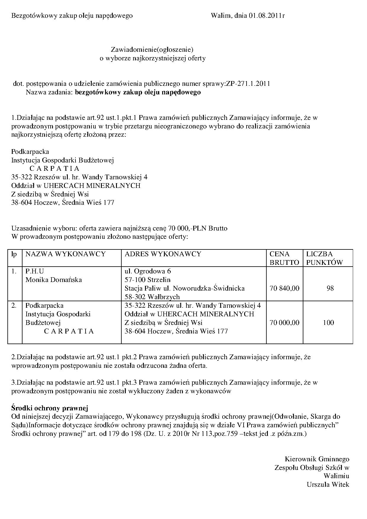 Dot: postępowania o udzielenie zamówienia publicznego. Numer sprawy: ZP-271.1.2011 Nazwa zadania: bezgotówkowy zakup oleju napędowego
